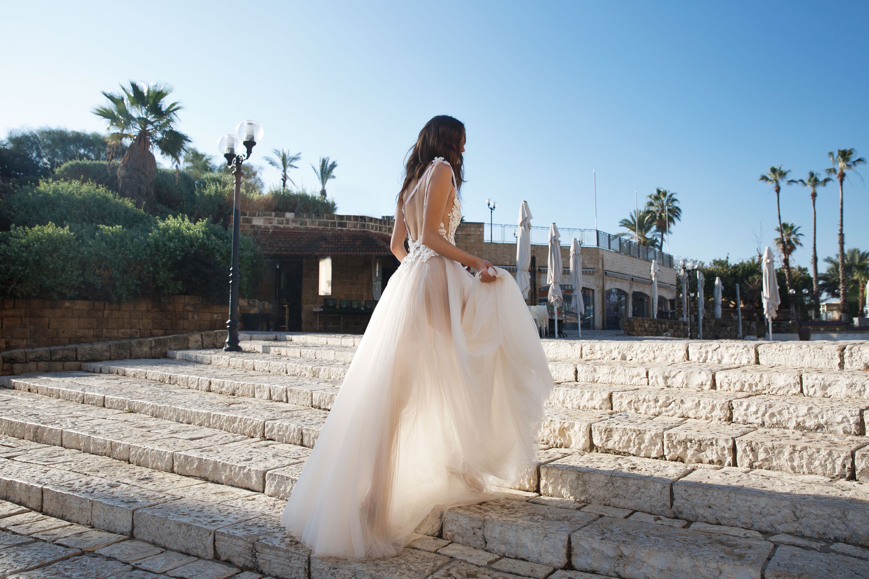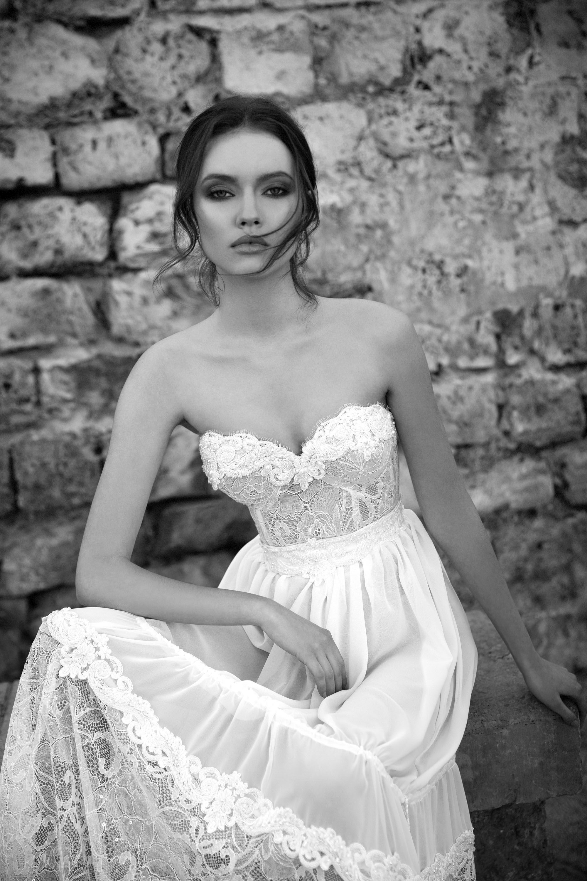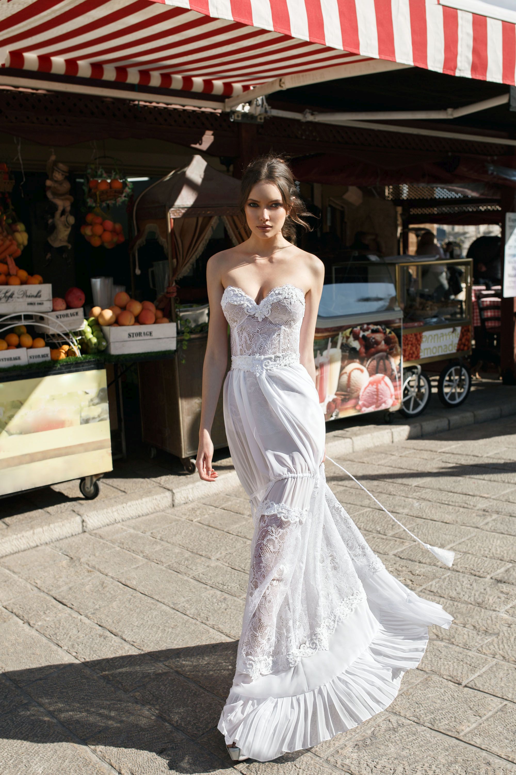 שמלה בגוון חלבי המשלבת פרחים אלגנטיים ופסים הנשפכת על הגוף באופן מושלם המחמיא לגוף הנשי והופך את הכלה לעדינה וזוהרת. -
