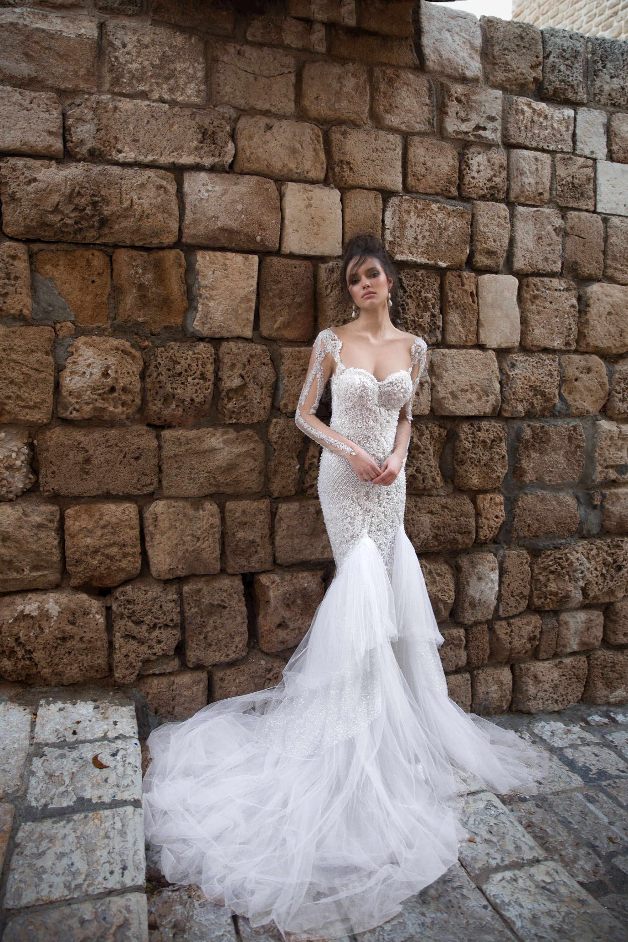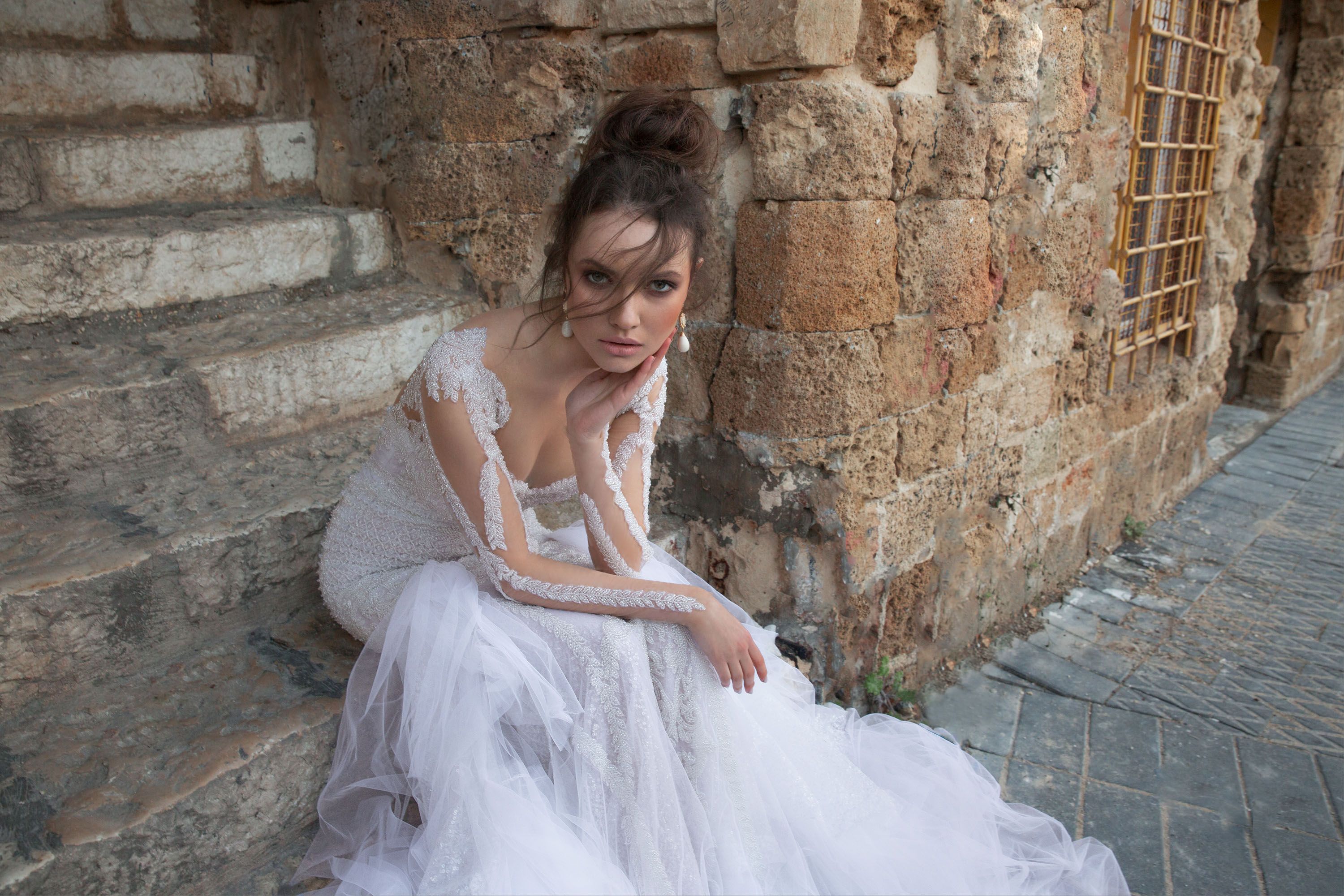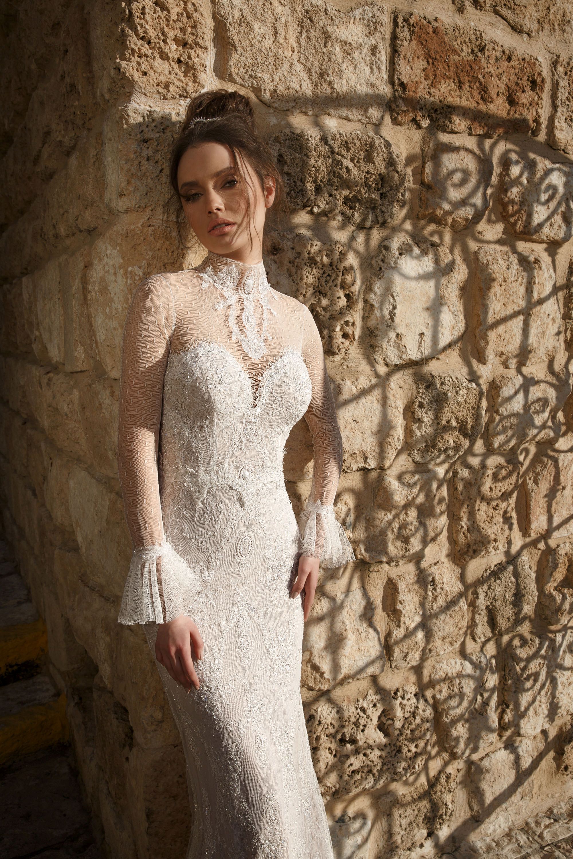 שמלה צמודה, נשית וסקסית בעלת צווארון סגור ואצילי ושרוולי טול ייחודיים המשווים לכלה את מראה בת הים העדין והאצילי. -