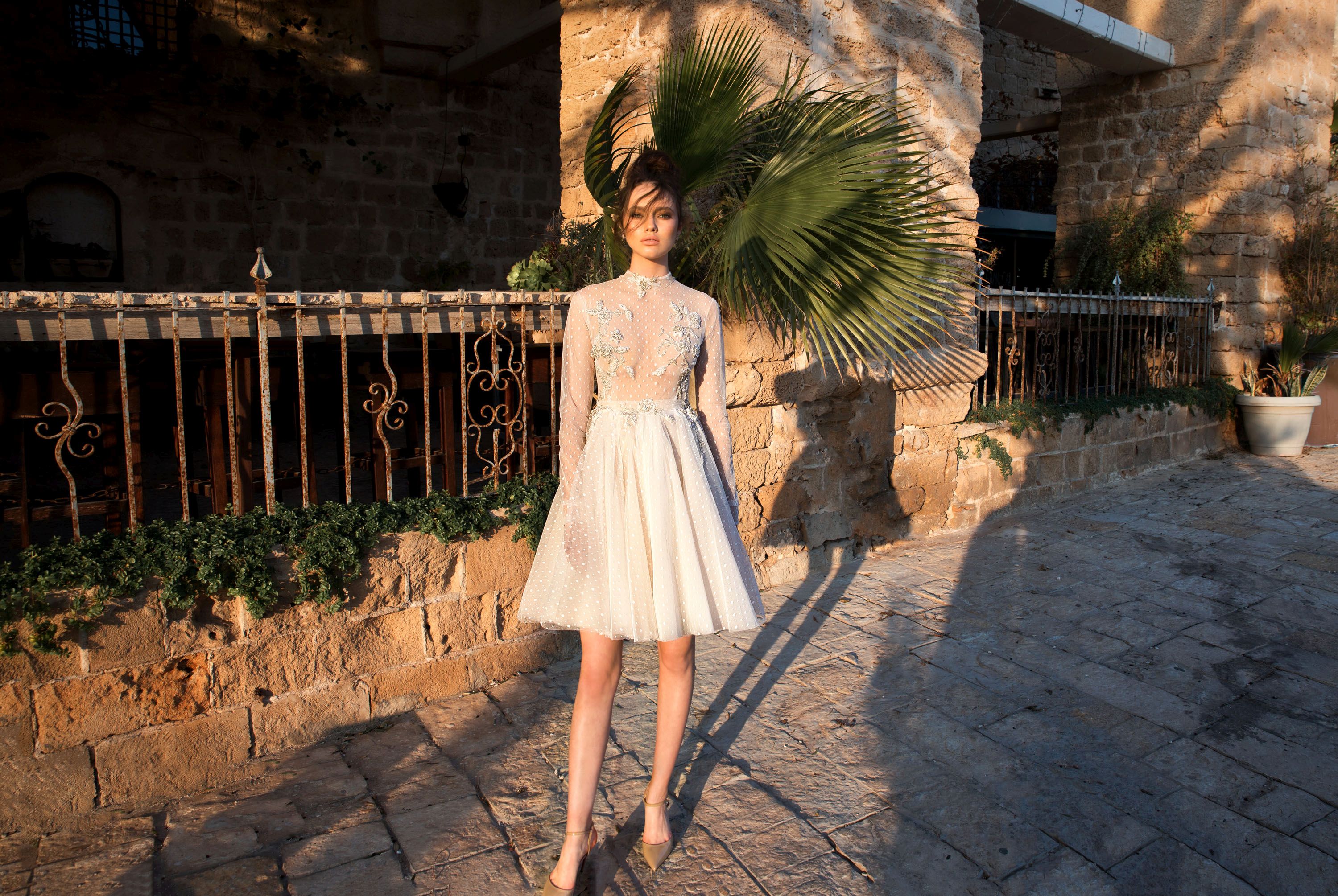 שמלה קצרה לכלות הרוצות מראה שובר שגרה וייחודי. השמלה כוללת חצאית טולים קצרה וחלק עליון שכולו סטרס אבנים כסופות ותחרה דקיקה ומרשימה. -
