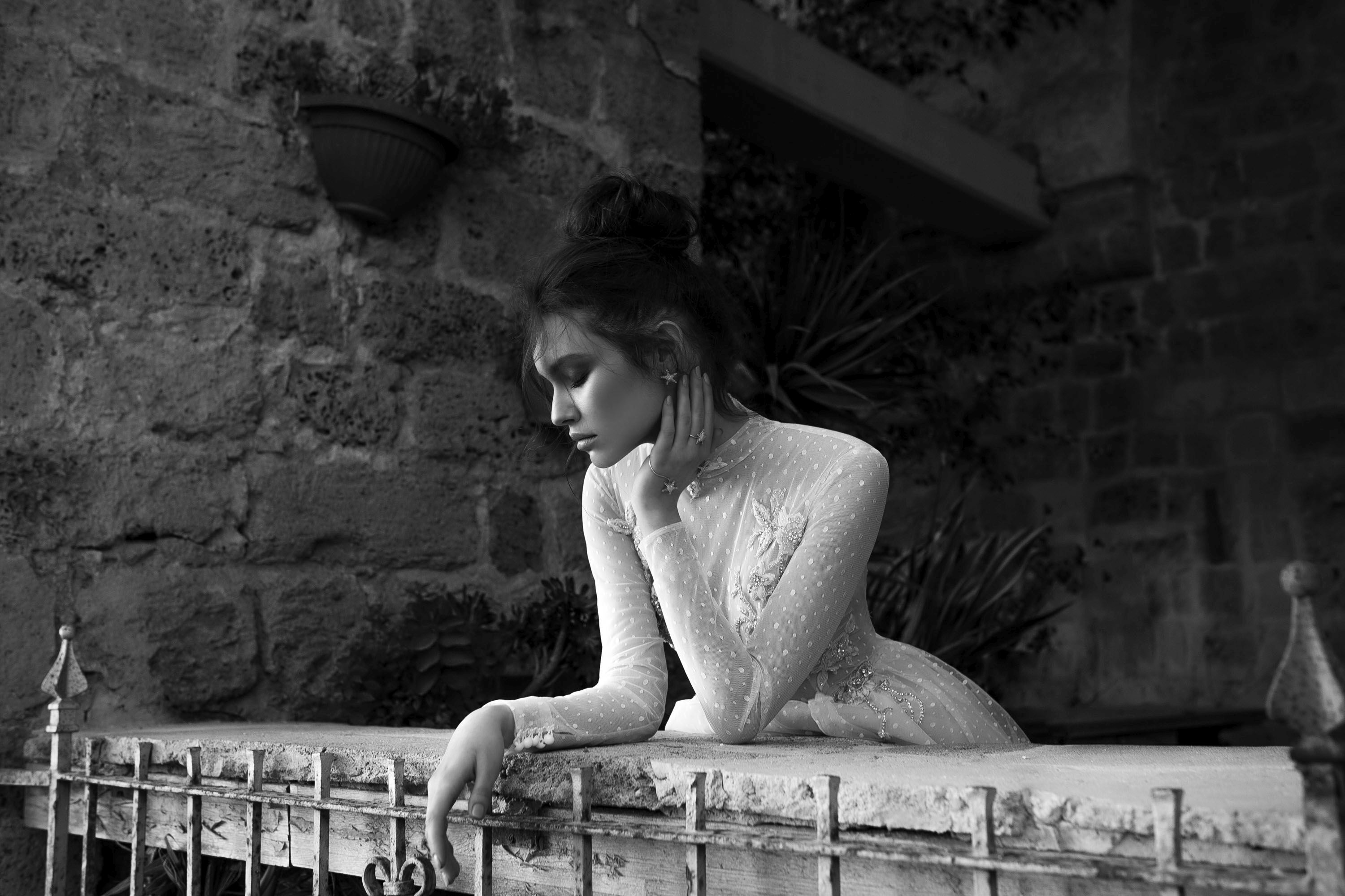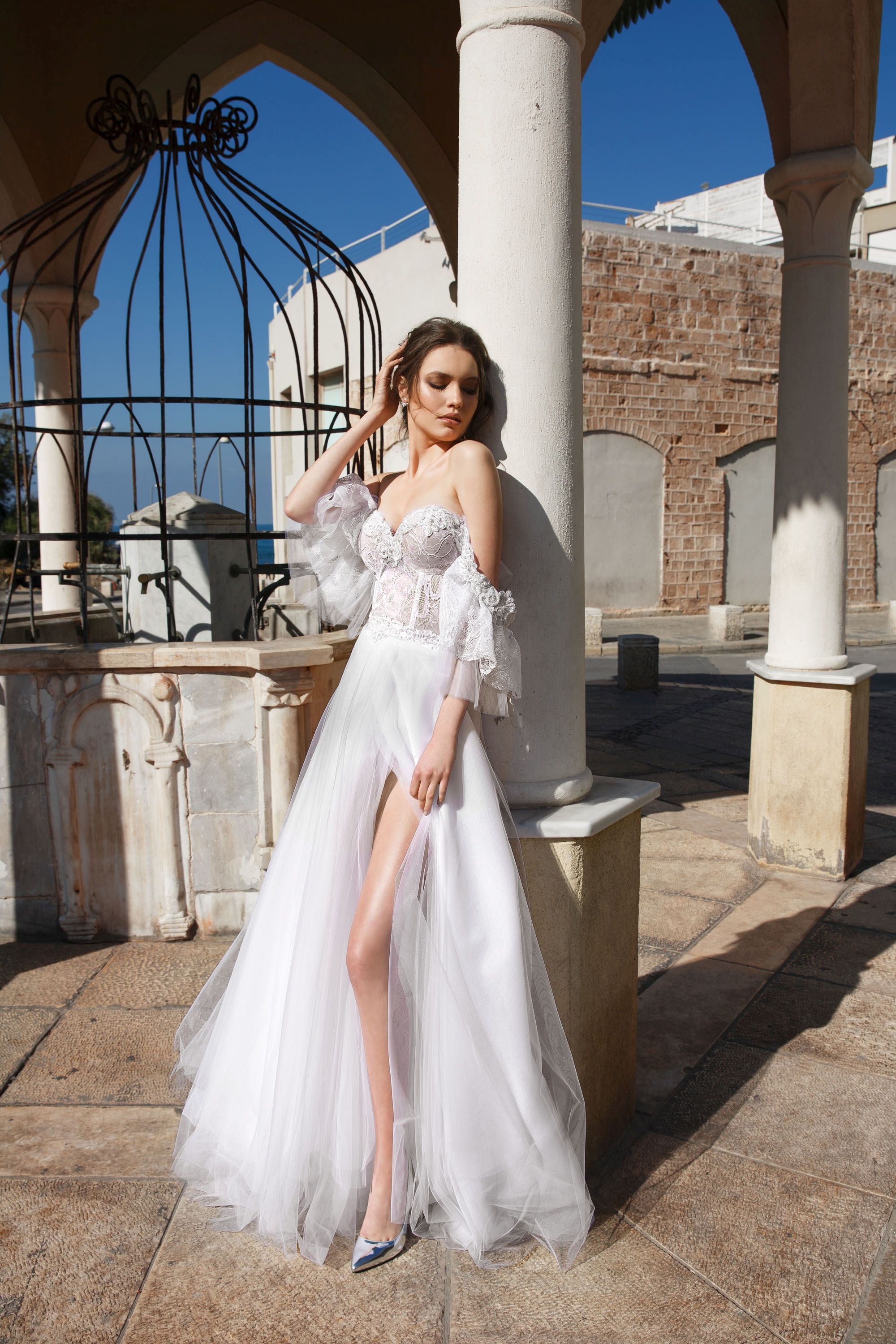 שמלת סטרפלס מרשימה ומיוחדת העשירה בשכבות טול מרהיבות ובעלת מחוך בחלקה העליון. טל המחוך מצטרפים שרוולים תפוחים ההופכים את כל הלוק לוינטג'י ושיקי במיוחד. -