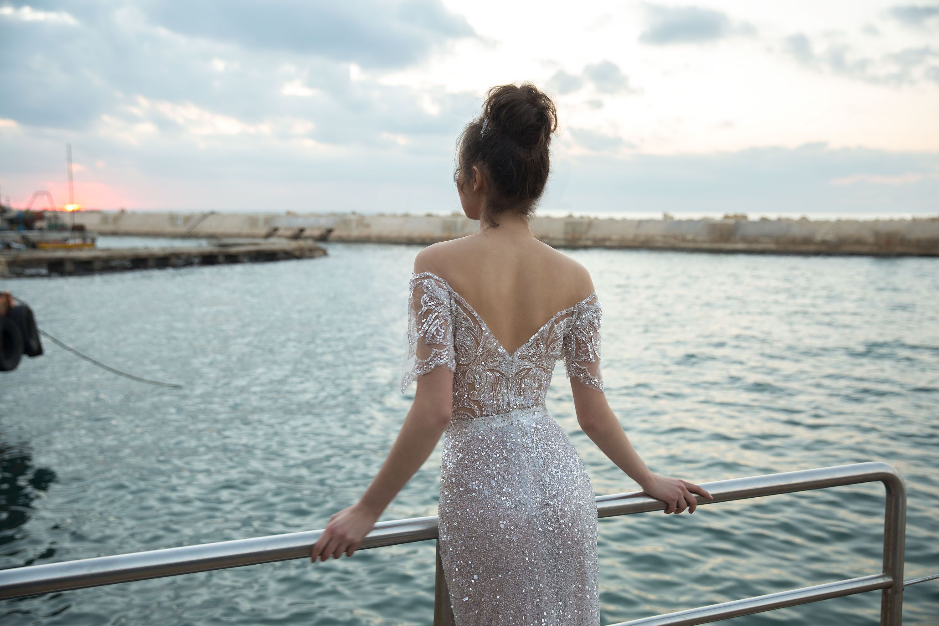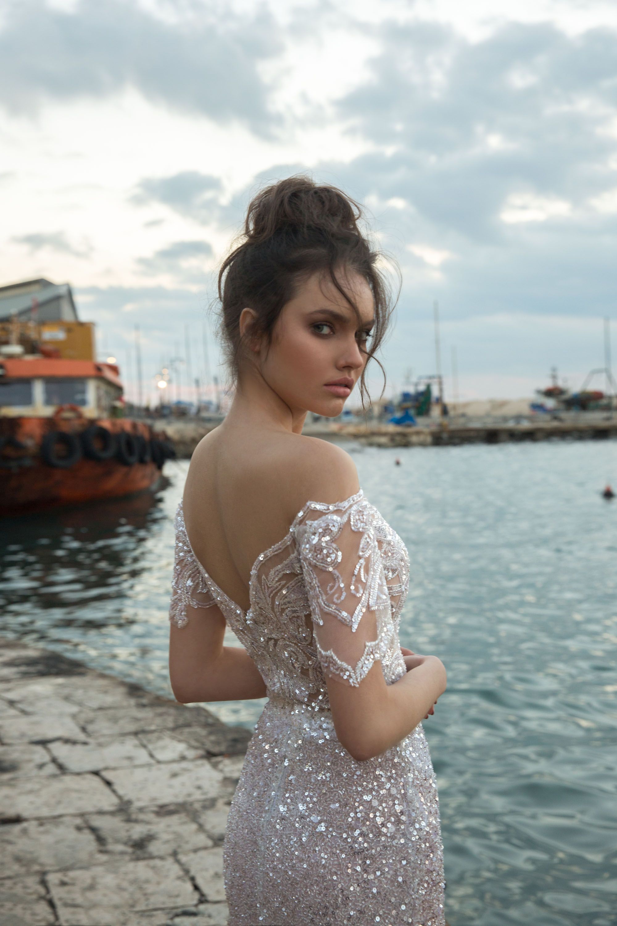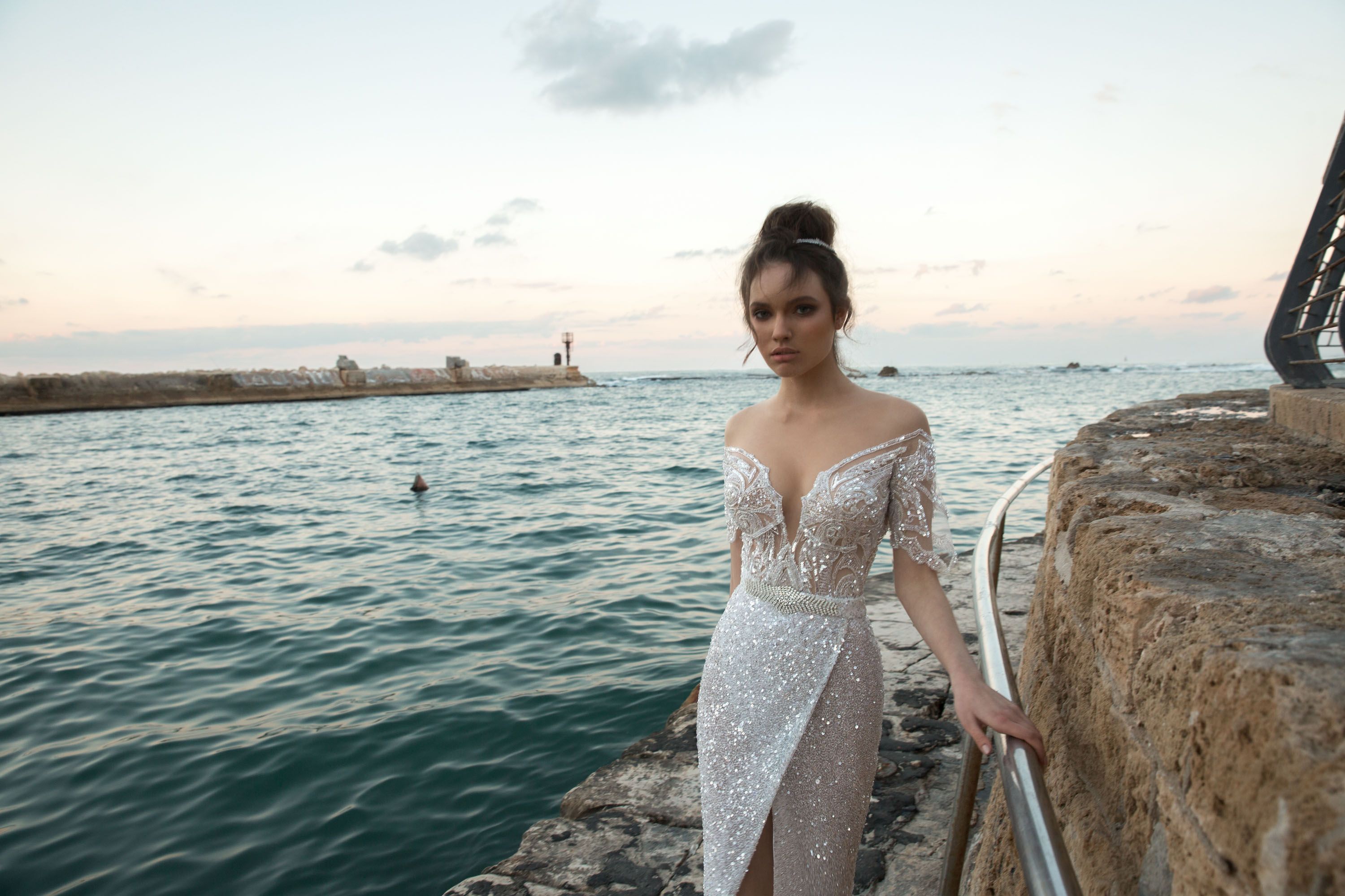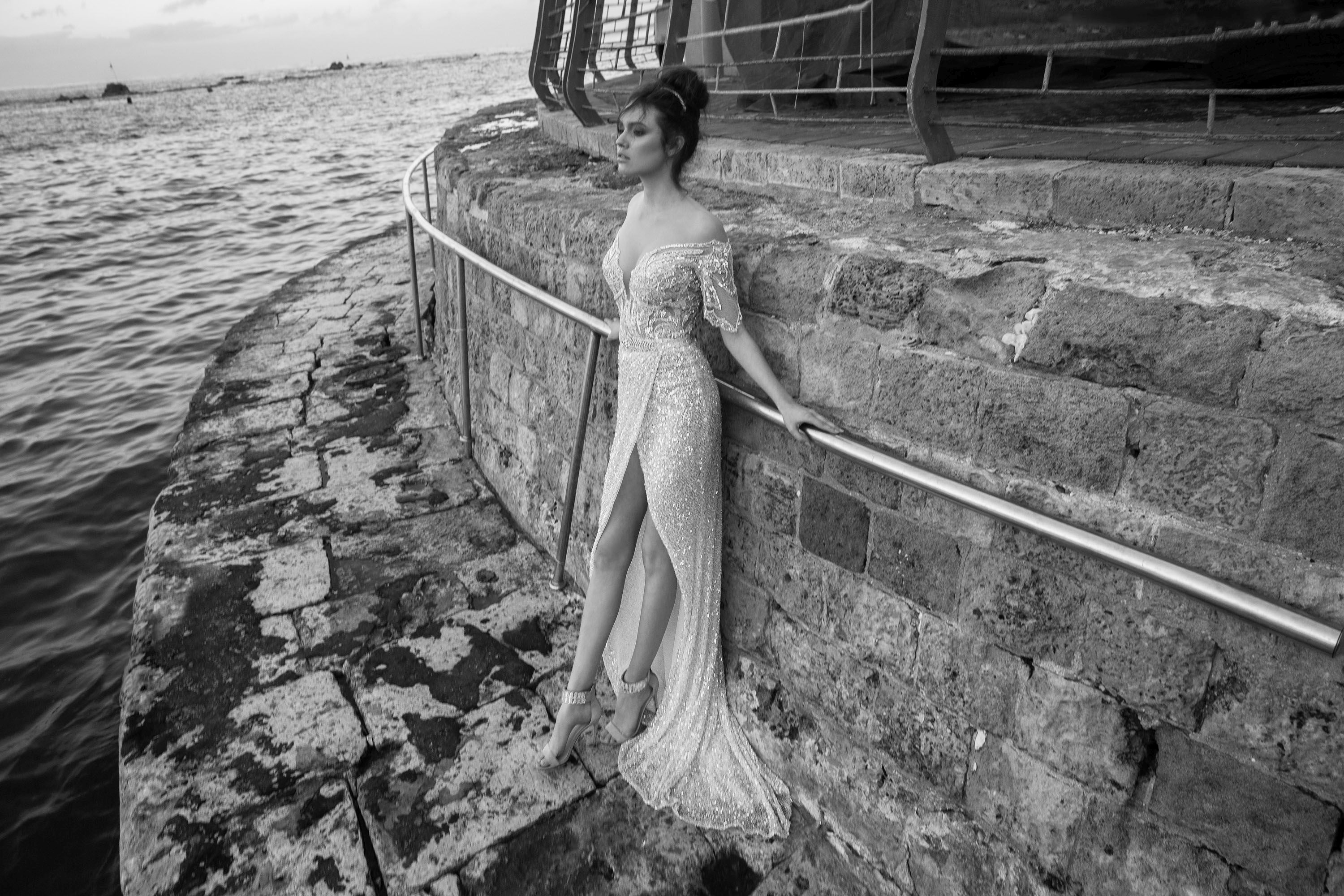 שמלה מרהיבה, נוצצת ומלאת סטייל בעלת מפתח עמוק החושף את הכתפיים ושסע סקסי המשווים לכלה מראה אצילי אך נועז. -