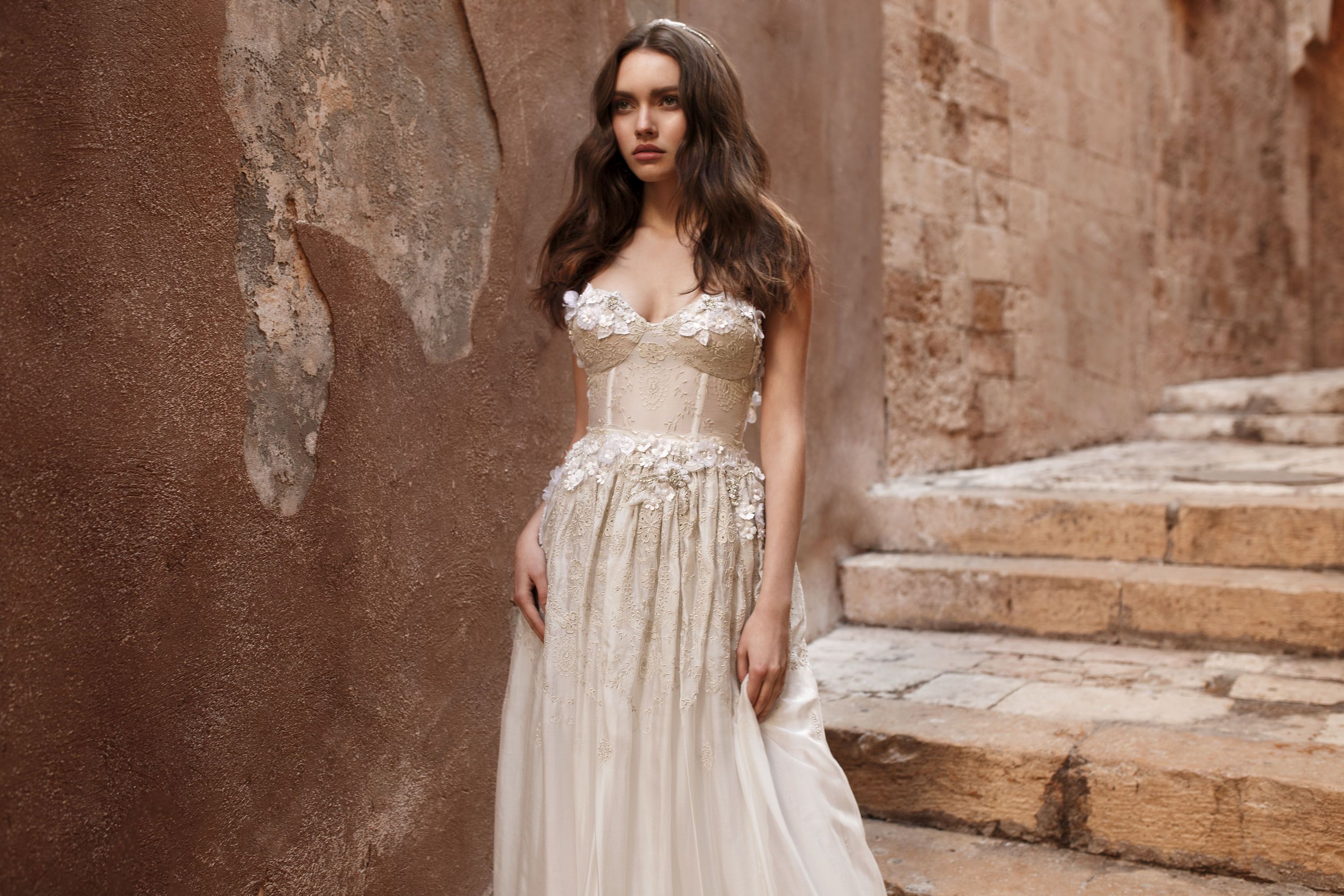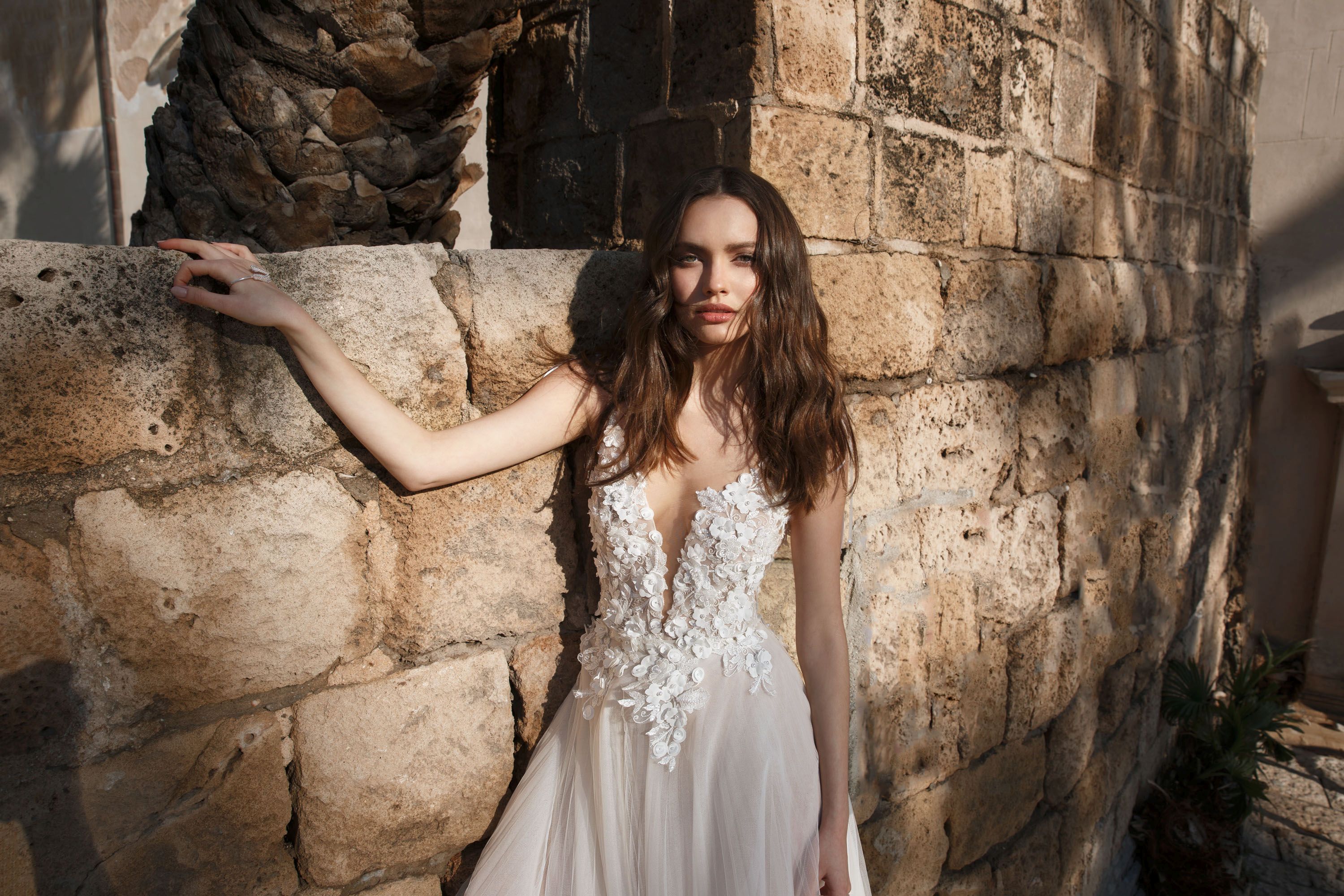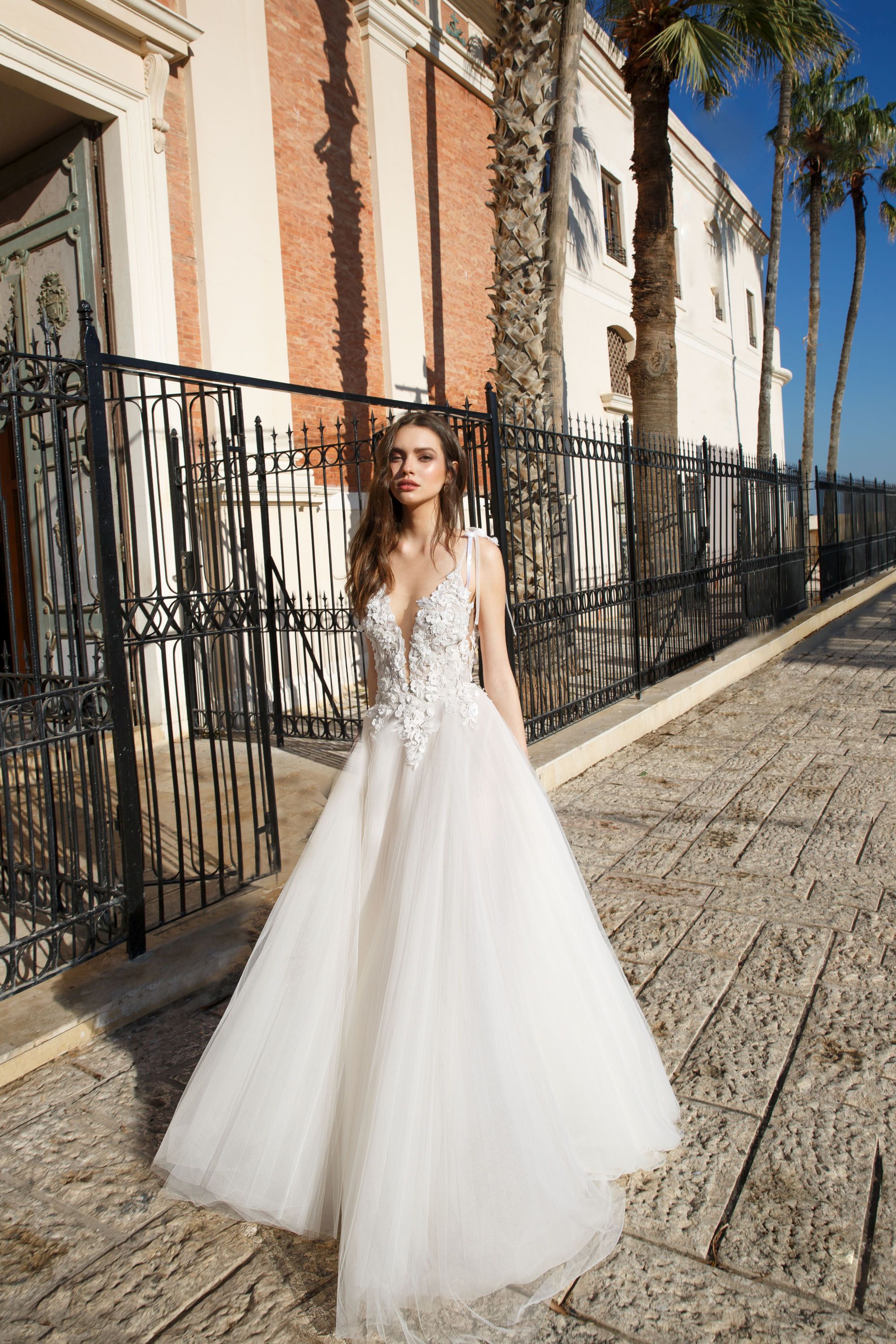 שמלה נפוחה בעלת מחשוף וי עמוק, כתפיות דקות עדינות וחצאית פליסה מרשימה. חלקה העליון של השמלה מורכב מחיבורי פרחים מרהיב הנותנים לשמלה טאצ' פסטורלי ושיקי. -